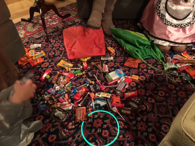 So, the conundrum… she’s at the age where she has now seen, taken mental inventory of and probably catalogued the amount of and different variety of candy in her goodie bag. What do we, the parents, do with it all??? We can steal a few pieces, but she’s no dummy; she’ll know if most of it’s gone. But she cannot possibly eat all this or her teeth will fall out of her head and I’m going to have a heart attack!
