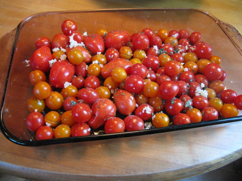 Drizzle with olive oil. Add a couple, two, tree (sorry, some of the French Canadian on my Mom’s side coming out…) chopped garlic cloves. Salt and pepper generously. Add a handful of your favorite chopped herbs from your stash (garden or vegetable drawer in your fridge). Put in 400 degree oven for about an hour and VOILA! Roasted tomatoes!