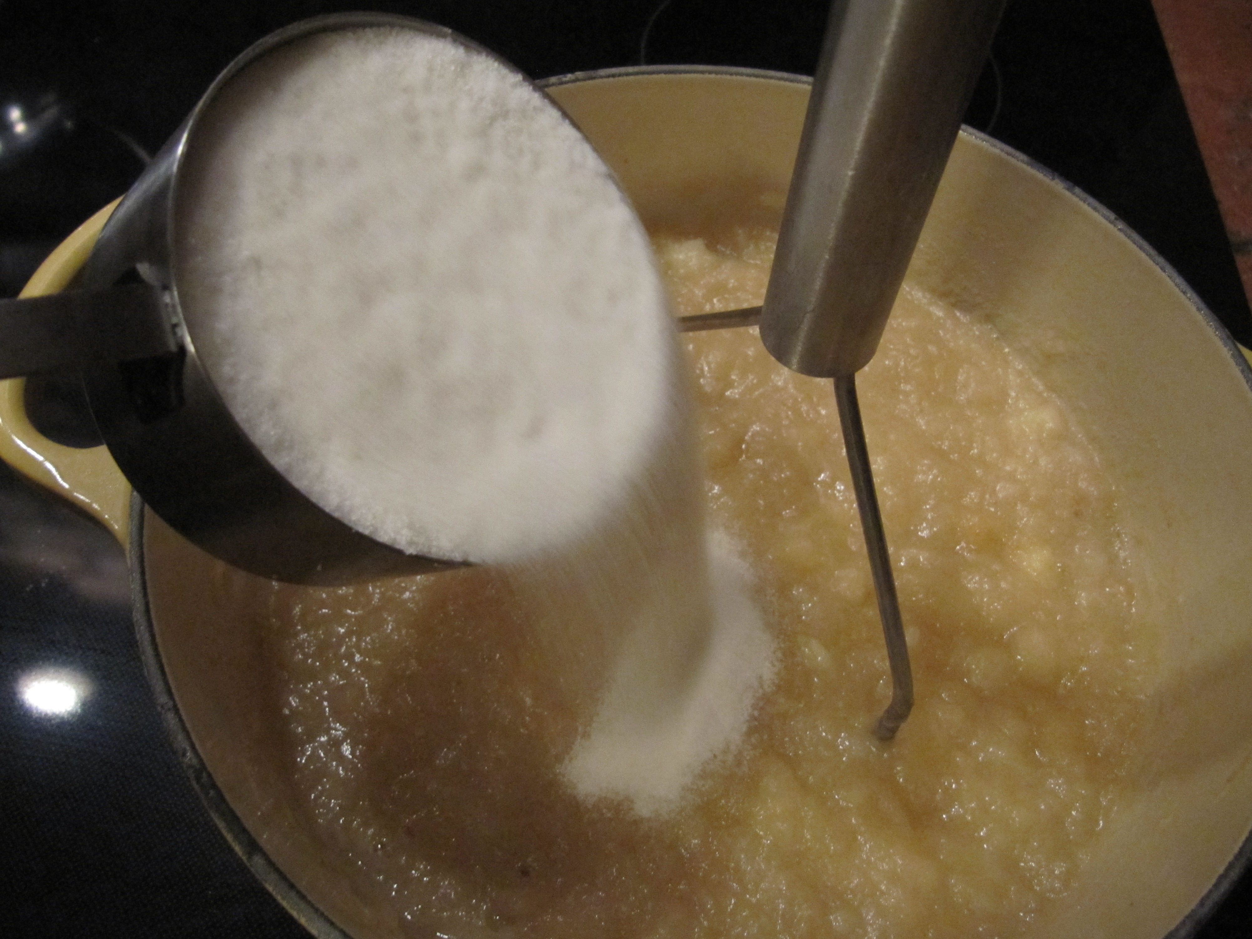 I, however, prefer my applesauce sweeter. My recipe uses 1 1/2 cups sugar and 1 1/2 teaspoons cinnamon. Try this smeared on a buttered english muffin for breakfast and you’ll never go back to peanut butter again!